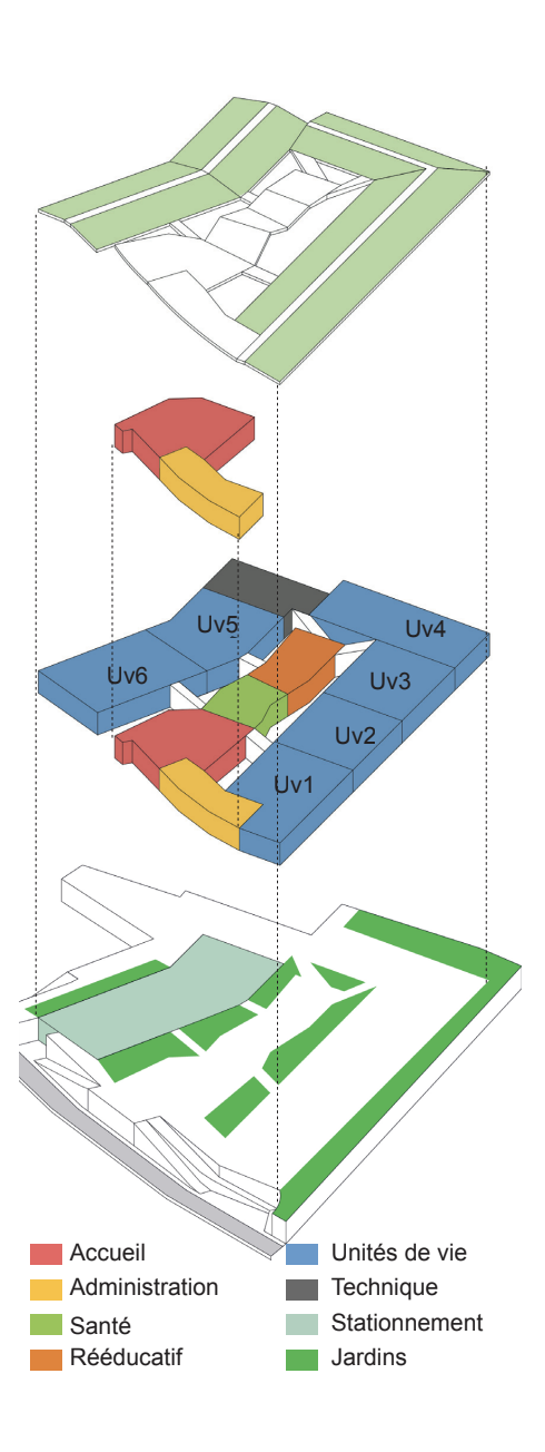 Les ailes des unités de vie, implantées en couronne autour des locaux communs, sont constituées par un volume linéaire assez bas, avec des toitures à deux pans à faible pente, cherchant à diminuer leur impact visuel pour les voisins.